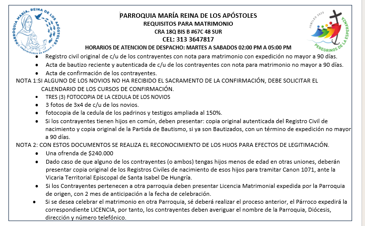 Para conocer los requisitos y fechas, escríbenos directamente a nuestro WhatsApp parroquial: 313 3647817.