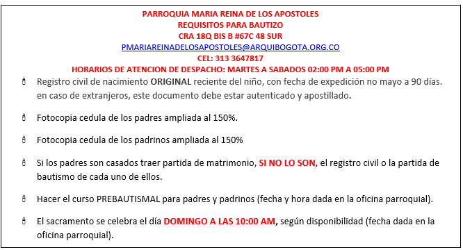 ¿Estás buscando información para el Bautismo de tu hijo, la Primera Comunión, la Confirmación o el Matrimonio? En la Parroquia María Reina de los Apóstoles estamos listos para acompañarte en este proceso.